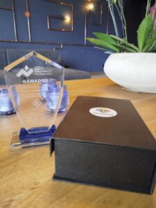 Recibimos el premio de manos de Maria Elena Velez, presidenta de AESabana, en el marco de la asamblea de la asociación en 2026.
